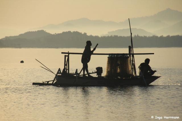 Fischer beim Netze einholen, Küste von Sekotong, Lombok